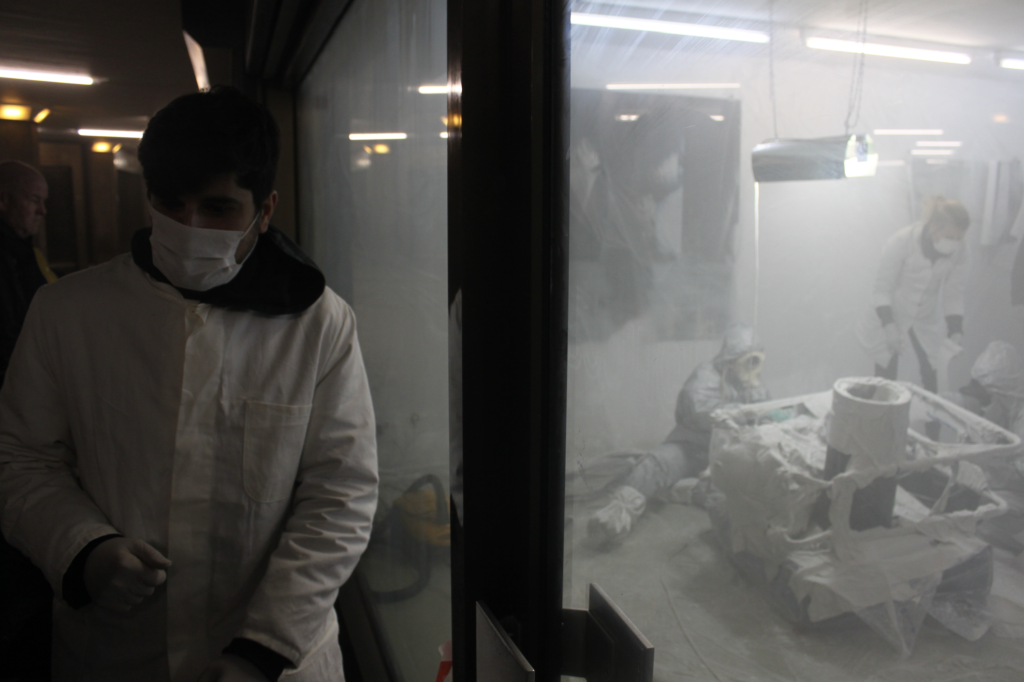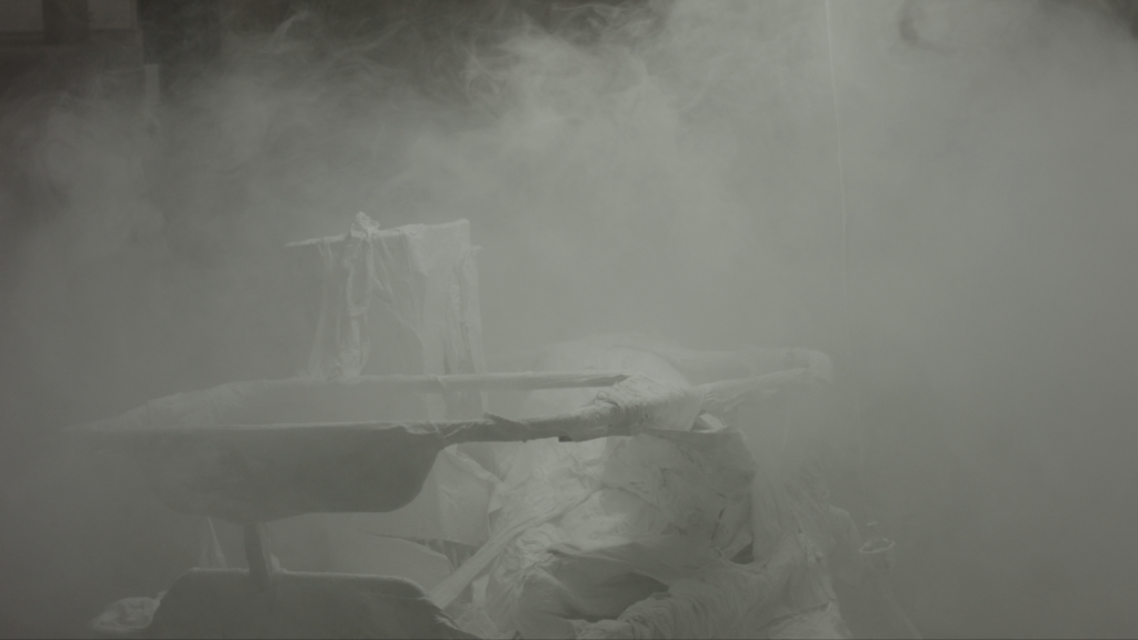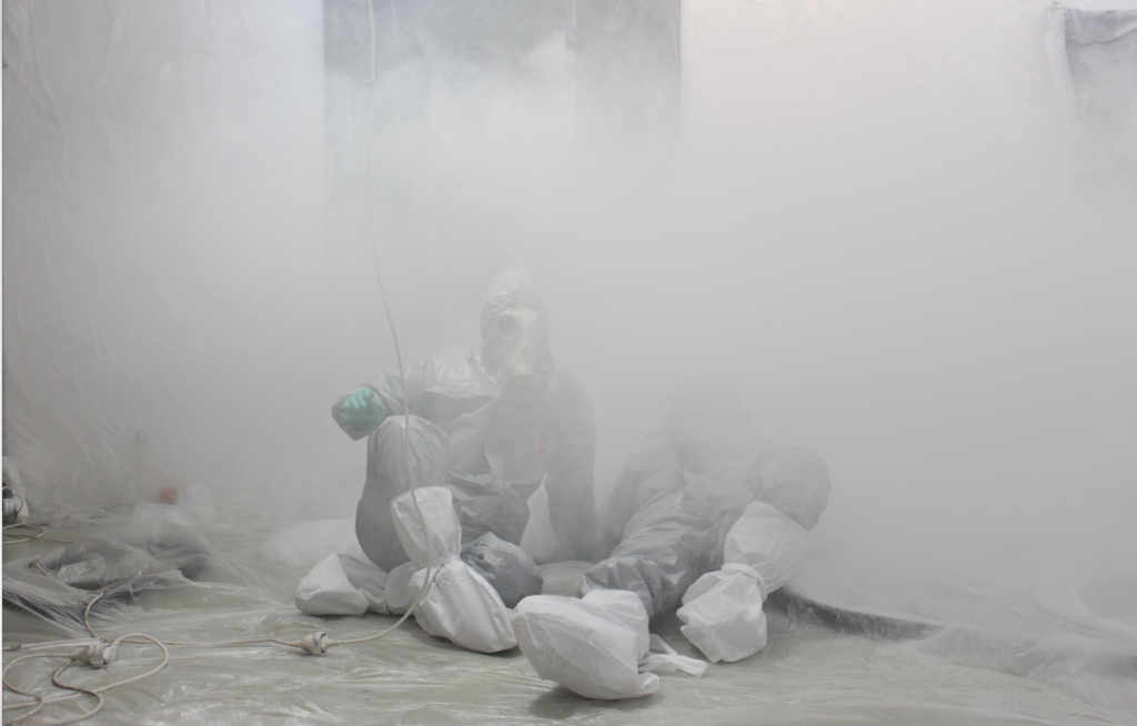 Hierfür werden die kontaminierten Werke am Eröffnungsabend im ersten Schritt luftdicht verschlossen. In einem zweiten Verfahren werden die Künstlerinnen die Werke und Gegenstände mit Gips umschließen, der die Objekte somit von der Umwelt trennt und für die Betrachter*innen unschädlich macht. Dieser performative Abschluss der Arbeiten verweist auf die Tatsache, dass einige der künstlerischen Werke erst durch die Kontamination und Zerstörung abgeschlossen sind, andere durch den Vorfall für immer in dem Zustand eines unmöglichen Abschlusses verweilen werden.