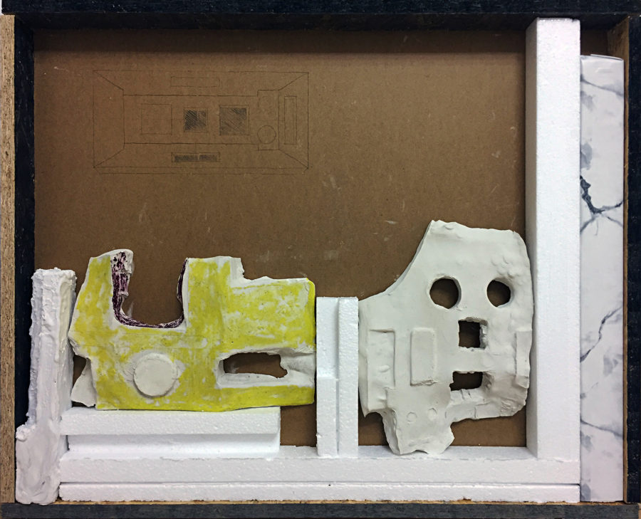 Juan Nazar brings archaeology and iconography together in a series of graphic works of small format that make up artifacts from disparate images. In his work, he classifies urban photography, found objects, and paintings according to their shape and color. In doing so, the artist builds directly from collections and arrangements. Fragmented images and objects set up the basis for a new structure to emerge: a monument, and subsequently, a possible ruin.